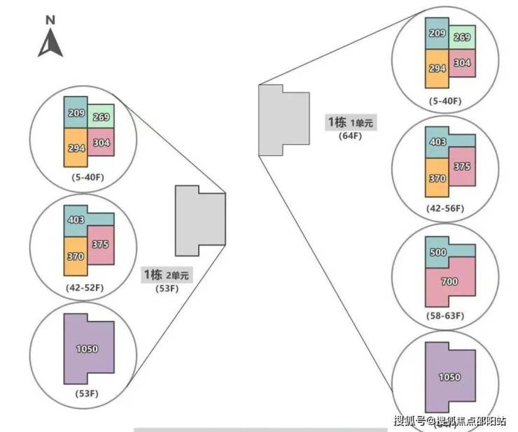 首推北区1栋、2栋,共约348套,分高低区设计: 低区(5层起,150米内):约209-304㎡四房以上大户型。 高区(42层起,150-200米):约370-403㎡ 4+1房五卫,带家庭厅及家政套间。 超高区(58层起,200米以上):约500-700㎡顶级大平层。 顶楼:约1050㎡整层大平层(仅3套)。