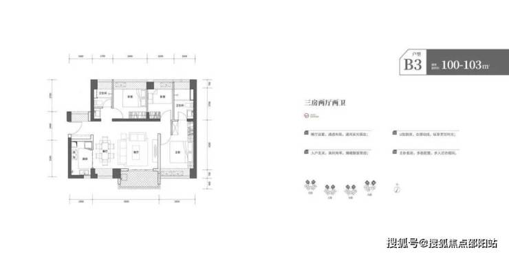 100-103三房两卫,横厅布局,动静分离。客厅侧出阳台,采光面较大,空间布局也比较合理。