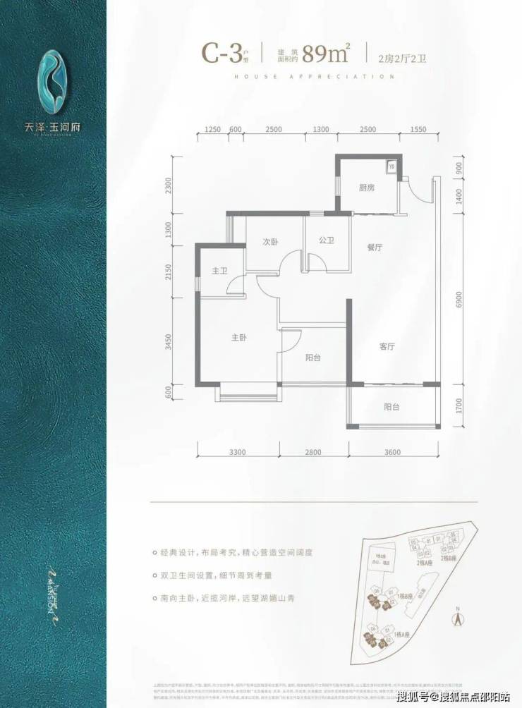 C2户型-89㎡-3房2厅2卫,2栋A座02/03,2栋B座02户型,设计的是竖厅格局,客厅3.5米开间,3个房间宽度分别为3/2.8/2.6米,公卫三段式分离,得房率:90.9%(包含赠送),阳台进深1.5米,东南朝向,看茅洲河景观。