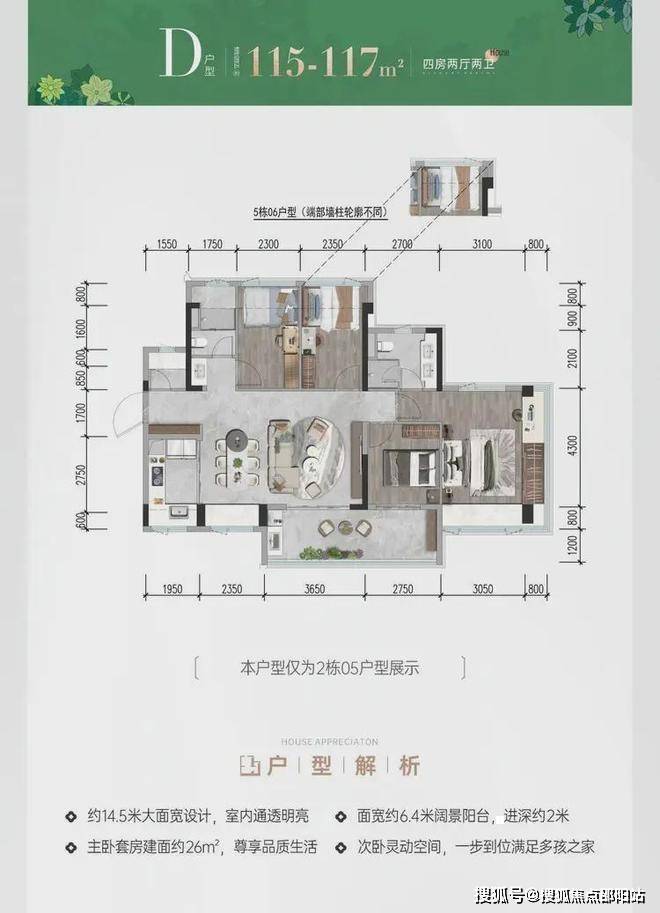 前海会展首发建面约78-117㎡三四房新规作品,户型拓展后实际使用率最高可达105%;主、次卧270°转角双飘窗(建面约117m次卧除外);建面约9-13㎡新规宽景阳台重构居住想象
