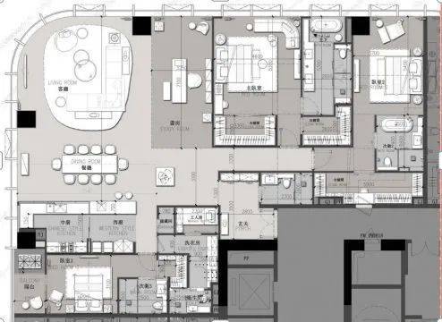 建筑面积约 439㎡,为 3 + 1 房 2 厅 2 厨 5 卫布局。该户型由 LSD 亲自操刀设计,拥有 270°城市与绿化景观,高区可看海景。采用全套房、双主卧设计,客餐厅开间超 10 米,方正主卧面积达 24㎡且为明卫设计,次卧带阳台,中西厨结合,还有多功能房,空间灵活多变。