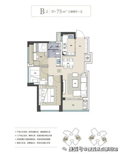 75㎡三房一卫户型:该户型采用LDKB一体化设计,外接南向阳台,主卧带同向飘窗,采光通风佳,空间利用率高。