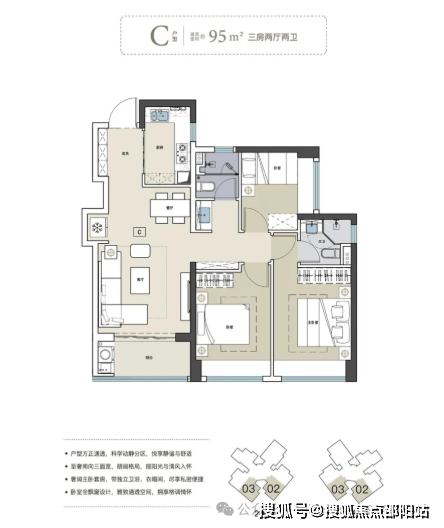 95㎡三房两卫户型:与75㎡户型设计理念相似,拥有开阔灵活的LDKB餐客厅,两个卧室与阳台同侧,均为南向,采光充足。
