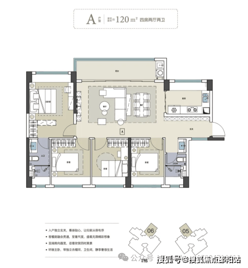 120㎡四房两卫户型:采用横厅设计,拥有一个11.4米的超大阳台,观景视野辽阔,且去除了竖厅必备的走廊,空间利用率更高。