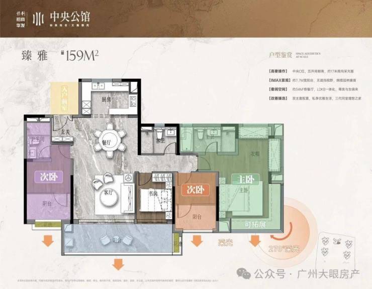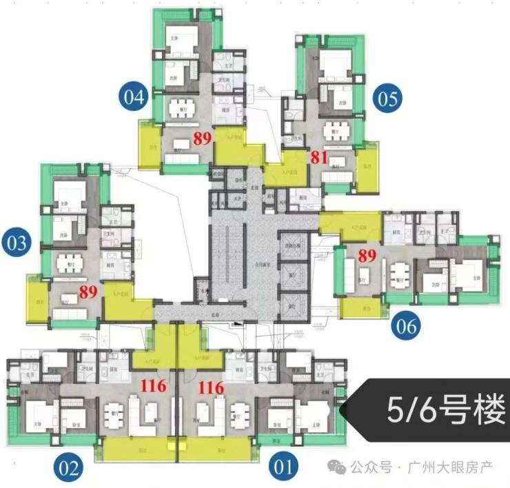 保利招商华发中央公馆采用了围合式设计,6栋47层高塔楼设计,小区自身配建有文化体育场馆和幼儿园,除了2#楼王是两梯四户,其余均为三梯六户,8#是5层高的文化馆,9#是配建3层高的幼儿园。