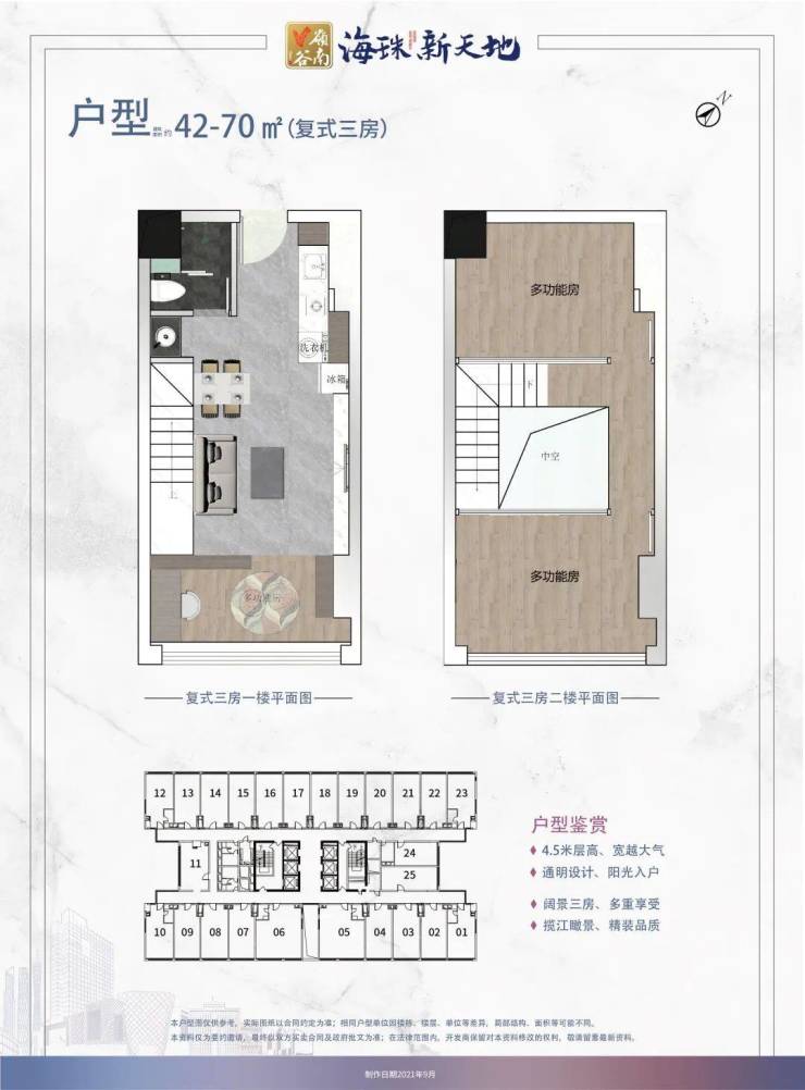 海珠新天地是一栋27层单体楼,其中1-4层是商业配套,6-24层是复式产品,25-27层是平层产品,总供货525套。