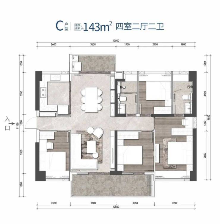 东南朝向,大开间短进深,通风采光性能良好开阔四房,竖厅与阳台相连,一进门就让人眼前一亮;餐厅、厨房、客厅、阳台一体化设计,功能灵活多变。客餐厅可直接通往阳台,业主可以在这里锻炼和娱乐,阳台还能作为生活空间的延伸;动静分区,每个房间都很开阔,居住舒适性高。主卧双飘窗设计,可双面采光,通透明亮,空间感更强;尤为贴心的是,主卧自带的洗手间采用了双台盆设计,让洗漱时光更为从容。
