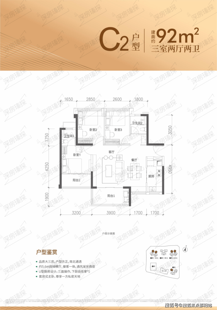 92㎡的3房2厅2卫,设计的是横厅南北通透格局,客餐厅5.6米开间,LDKB一体化设计,四开间朝南,3个卧室分别做到了主卧12.43㎡/次卧9.22㎡/次卧8.84㎡(实测面积,去掉墙体飘窗),U型厨房,公卫三段式分离,得房率约96.08%(包含赠送),阳台主朝西南或东南向。靓点都不需要睡飘窗。