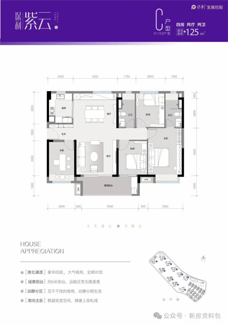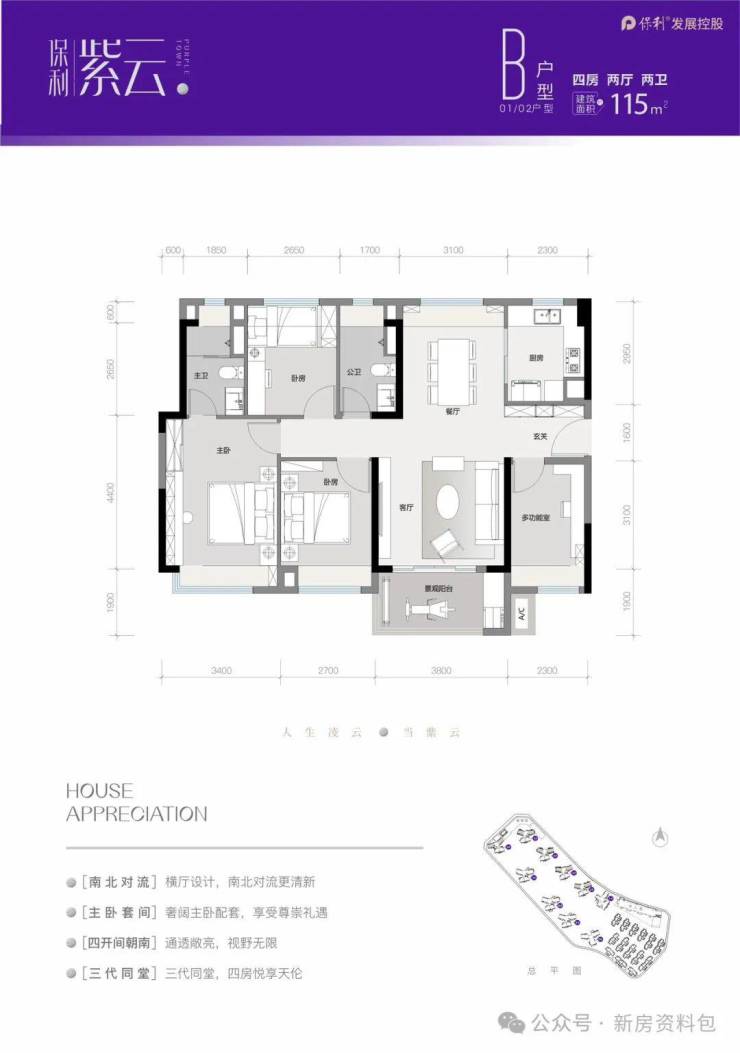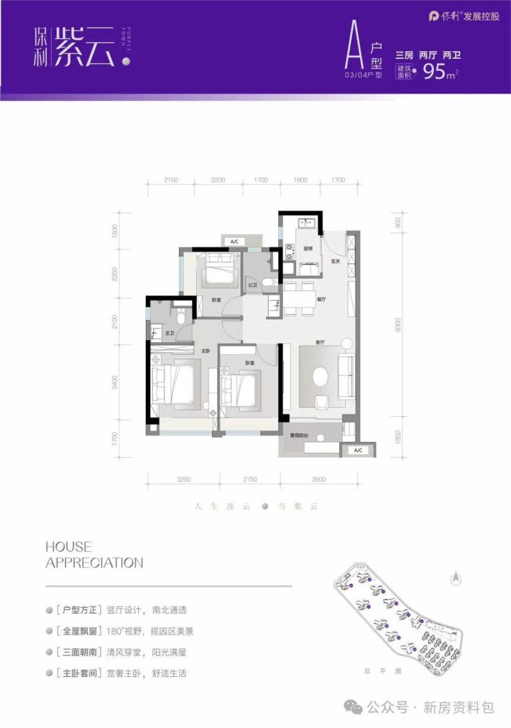【保利紫云】基础信息• 总占地:4.77万㎡• 总建面:15.9万㎡• 绿化率:35%• 容积率:2.5• 总户数:998户• 车位比:1:1.2• 洋房产品:约95-125㎡精装三四房• 别墅产品:约143-180㎡人文院墅• 收楼时间:2023年6月• 物业公司:保利物业• 物业费:洋房3元/月/㎡,别墅4.2元/月/㎡———【保利紫云】八大必买理由———• 必买理由一:实力央企,世界500强保利央企世界500强,国家一级房地产开发资质企业,连续12年荣膺中国房地产行业领导公司品牌,是中国最具实力的地产发展商之一。