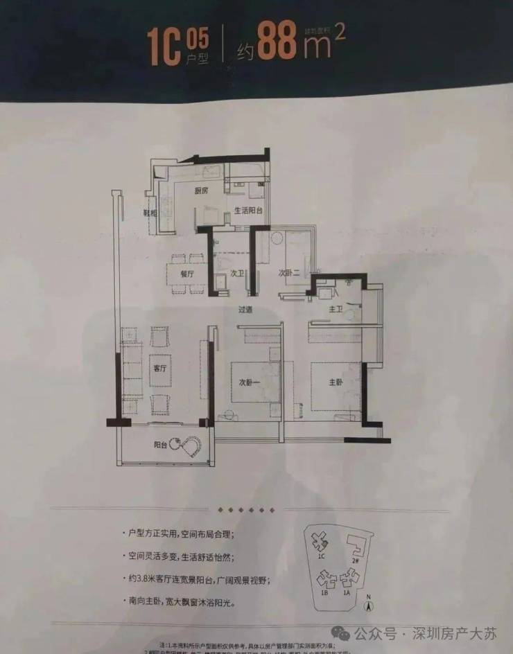 88㎡的3房2厅2卫(1栋C座05户型),设计的是竖厅格局,客厅3.8米开间,动静分区,三开间朝南,主卧大套间设计,L型厨房,还带1个生活阳台,得房率:77.27%(不含赠送),阳台东南朝向。