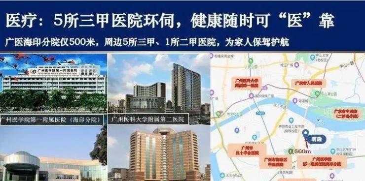 600米内有广州医学院第一附属医院海印分院,1公里有海珠区第一人民医院、广州市海珠区中医医院以及广州医科大学附属第二医院、广州医科大学附属第一医院等。