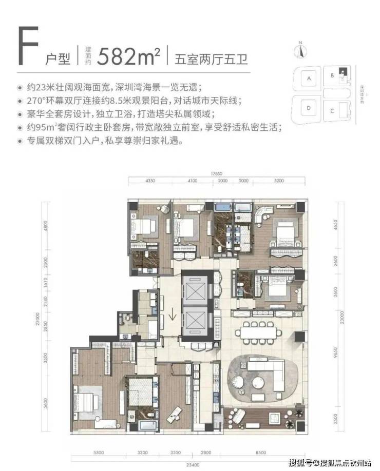 观景阳台:高区340平米户型,东面23米宽无敌海景视野(塔楼总观景面约46米)