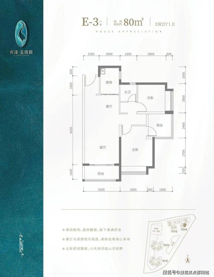 E2户型-80㎡-3房2厅1卫,设计的是竖厅格局,客厅3.5米开间,餐客厅一体化,阳台2.8米长,朝西向。