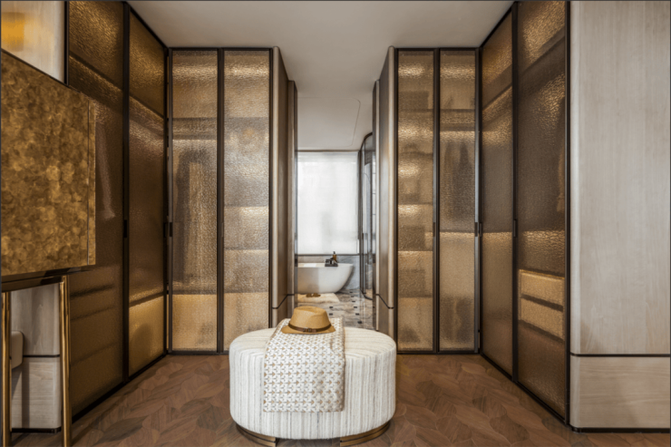 柜子采用知名品牌的质量配件,配置了各种实用的收纳架,卫生间的镜子自带除雾功能并配备了美妆冰箱。衣帽间的整个柜子骨架是结实轻便的铝合金,配上低透光的玻璃柜门,尽显高级又清爽。