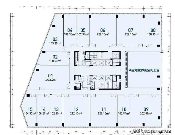 为办公,低区为商业,标准层建面约2400㎡,层高4.5米。