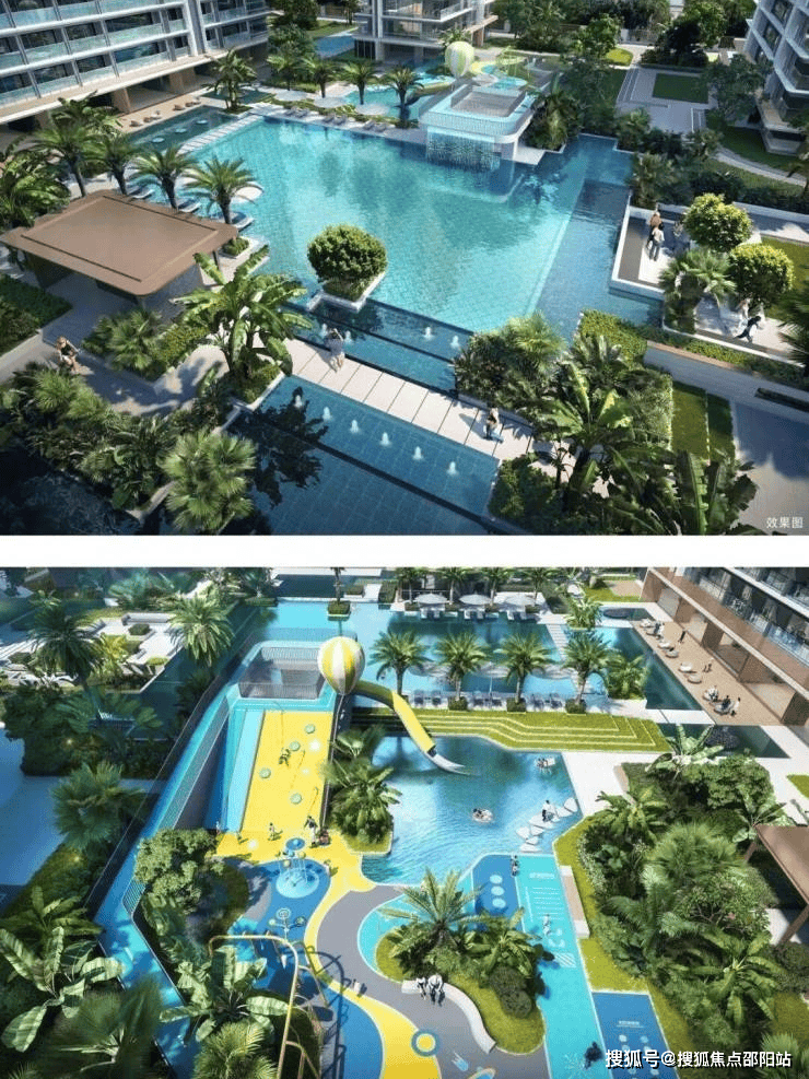 汲取曼谷四季酒店灵感,无边际泳池将奢华建筑与野奢景致自然相融,分区打造立体儿童泳池,特有的叠水景观、水上滑道、攀岩爬道等多元游乐设施,结合城市会客厅、亲水平台和水上汀步等多重景观,营造野奢型国际化度假体验。