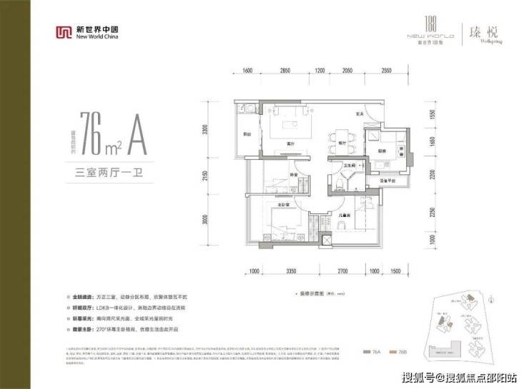 76㎡三房一卫:经典竖厅格局,客厅3.3米开间,LDKB一体化设计,动静分区。U型厨房,卫生间干湿分离,带1个设备阳台约1.5㎡,阳台约5.28㎡。套内约68.6㎡,得房率约90.3%(含赠送),76㎡能做成正规三房,确实有点东西。东北、西北或东南朝向,共90套。