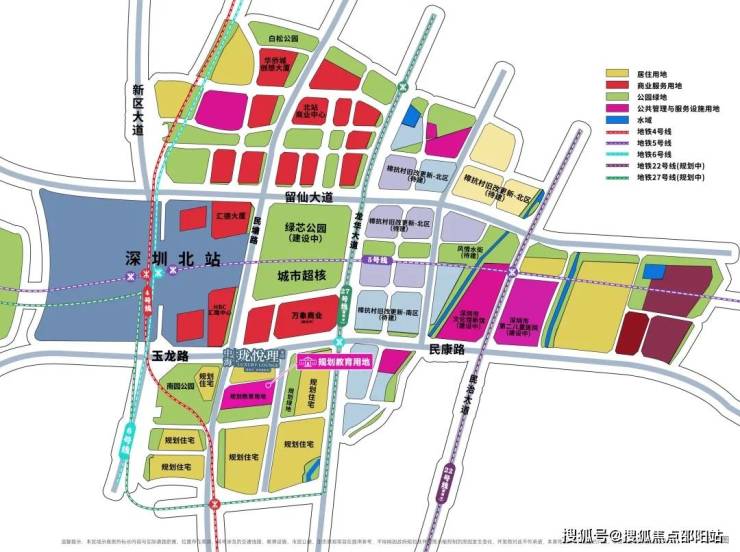 ● 构建双芯交汇、枢纽门户,以双芯三谷设计理念,融汇超级枢纽芯、超级绿芯、北部创享办公谷、南侧多维活力谷、东侧风情水街等规划,连通深圳市文化馆新馆、深圳市第二儿童医院、民治体育公园、北站中心公园,共同构建成龙华超级中央中轴线,住宅用地较为稀缺。
