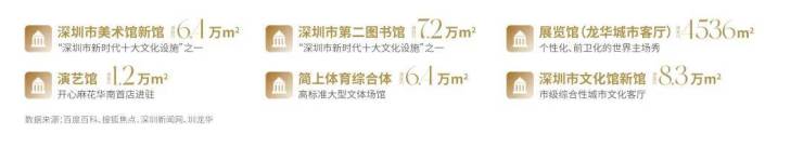 ◎超核能量空间站、◎深圳市文化新馆 (建设中) ◎白石龙文化艺术中心、◎深圳美术馆新馆 (建设中) ◎深圳市图书馆北馆(建设中) ◎展览馆 ◎演艺馆、◎简上体育综合体,成就深圳下一个城市人文配套高地。