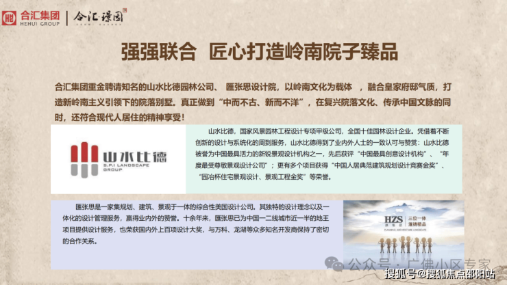 合汇璟园项目总占地面积约6.18万㎡,是由增城本土第一开发商,大师级品牌设计。合汇集团,创始于2004年,是一家异军突起的新锐房地产企业,以房地产开发为主业,涉及商业经营、物业管理、矿产资源开发等业务领域。项目邀请了众多名大师联手设计,其中有来自美国的全球顶尖规划建筑设计公司【匯张思】设计。园林设计上邀请了著名的山水比德,打造顶级别墅项目。