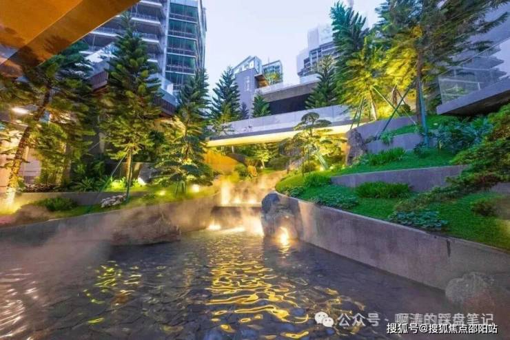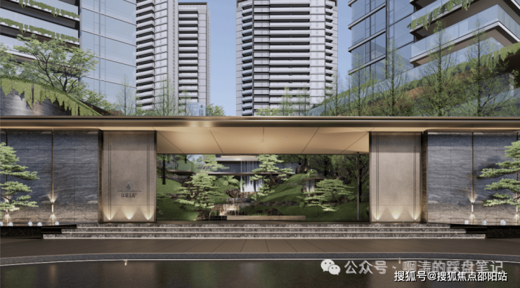 小区门庭落成15米落差瀑布,五棵悬崖式迎客黑松作揖相应,归家仪式感满满