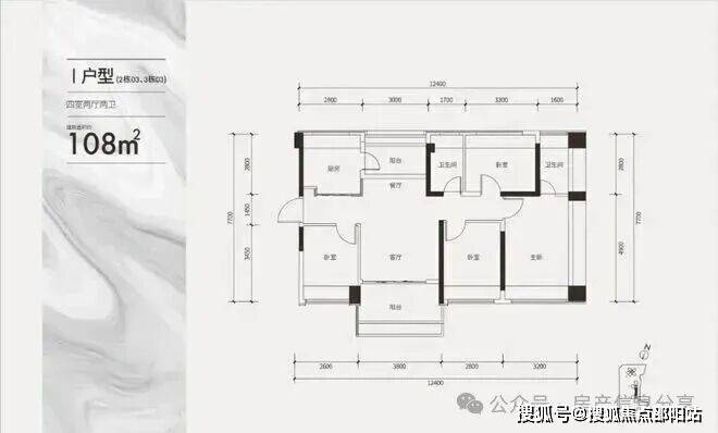 建面约108㎡双龙抱珠四房户型