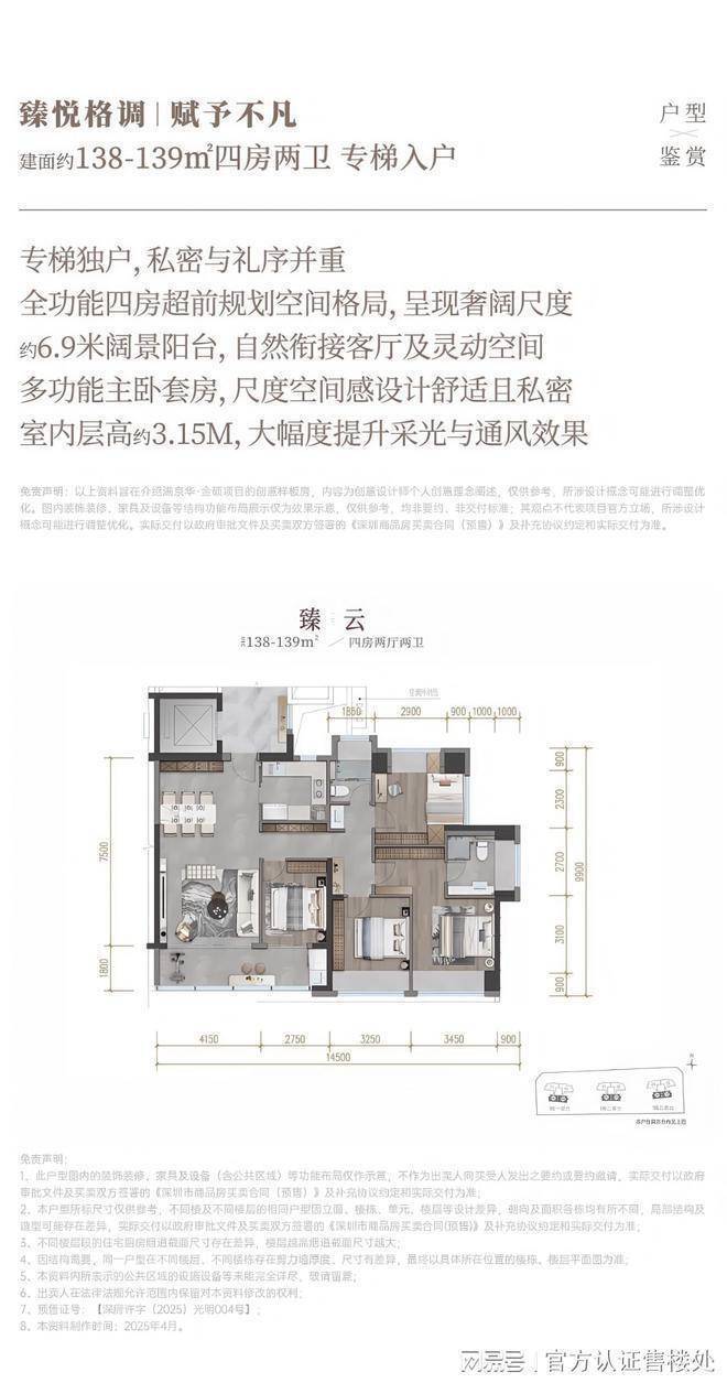 「满京华金硕臻府」推出1栋1/2/3单元,共420套房源,面积有138-139㎡的4房2厅2卫,202-204㎡的4房2厅3卫户型,作为光明顶豪楼盘,金硕臻府做到了一梯一户,专梯入户的奢阔大空间,3.15米层高,其中光明仅有的204平大户型基本是千万起步门槛,预计在2026年10月份交房,138平户型带精装交房,204平户型带简装交房。