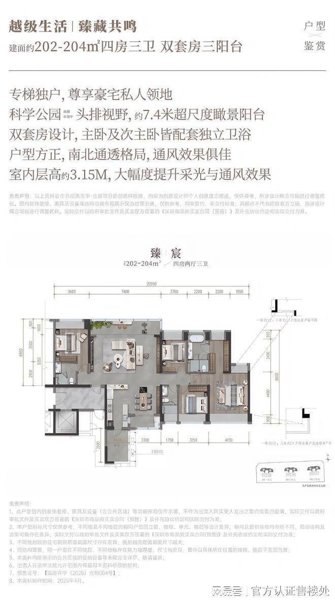 204㎡的4房2厅3卫,设计的是横厅南北通透格局,独立专梯入户,客餐厅7.4米开间,LDKB一体化,超大客厅+双套房设计,4个卧室分别做到了主卧33㎡/次卧16.1㎡/次卧13.54㎡/次卧11.61㎡(包含墙体飘窗),客餐厅出7.4米长的观景大阳台,直面科学公园,L型厨房带1个生活阳台,卫生间干湿分离,东北朝向。