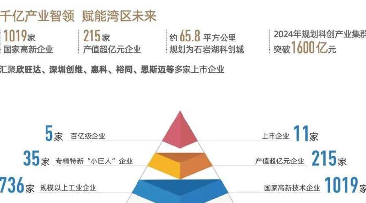 石岩科创城(规划面积65.8万平方公里)汇聚高端科技资源,驱动产业升级,形成产业集群效应,成为推动区域经济高质量发展的关键引擎。在2024年已汇集超过1019家国家高新技术企业,拥有215家产值超亿元企业,已汇聚欣旺达、深圳创维、惠科、裕同、恩斯迈等11家上市企业,规划科创产业集群突破1600亿元。
