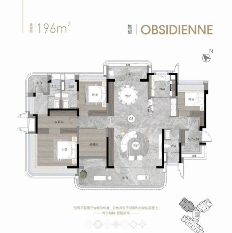196平的户型,同样采用三面采光的户型布局,并利用多线条的对流动线,实现全屋采光、通风。