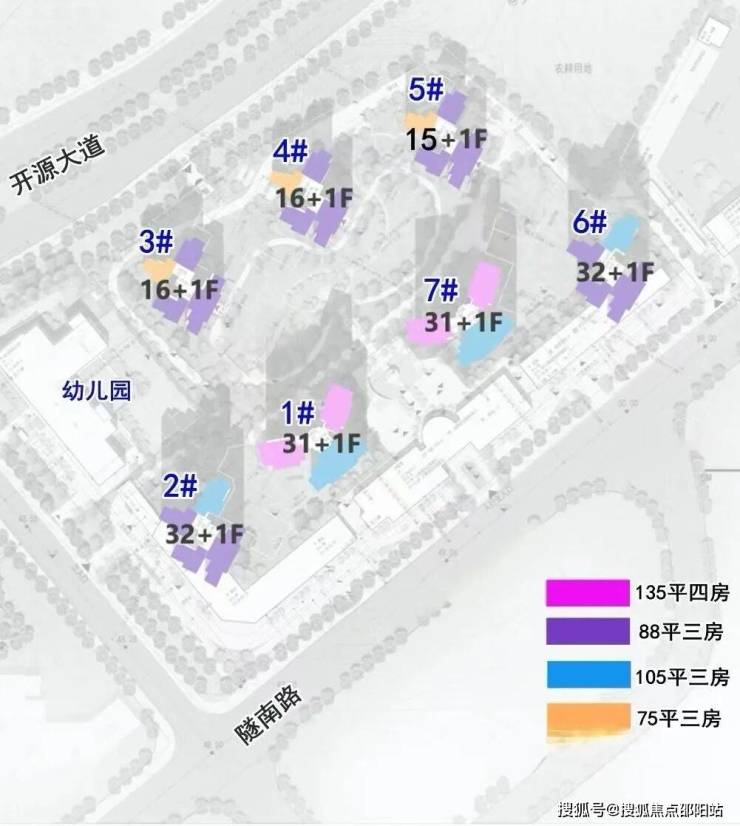 其一,散点式排布,每栋楼都是独立的,楼栋左右有三四十米的间隔,最大化提高了楼栋两侧单边位的采光面和视距。