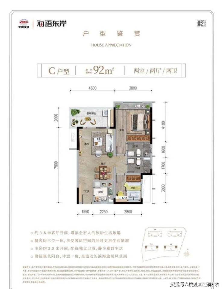 C户型:建筑面积约92㎡,两室两厅两卫。方正布局,功能分布科学合理,约3.8米客厅开间;餐客厨三位一体,室内通透、采光通风良好;主卧约3.8米开间,配备独立卫浴,静享雅致生活奢阔观景阳台。