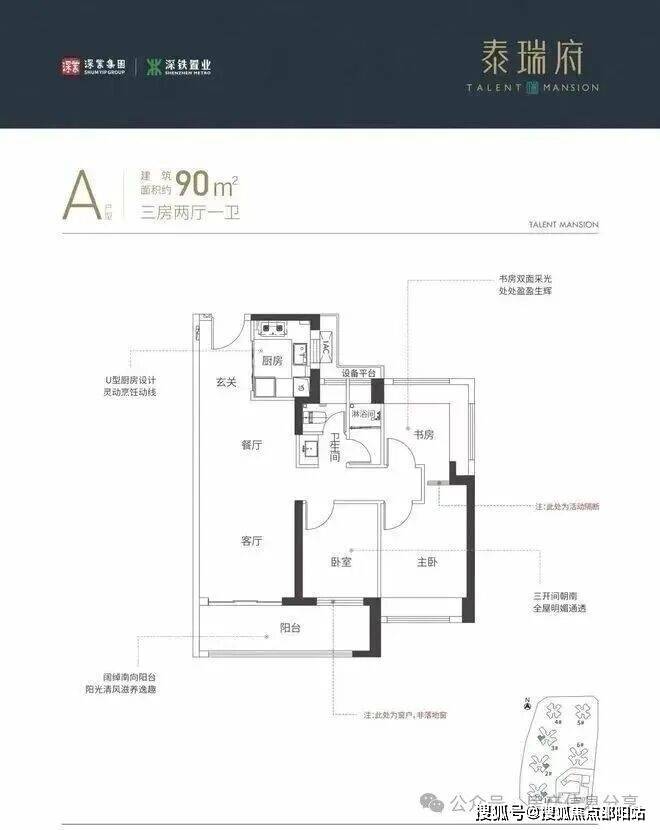 90㎡的3房2厅1卫,设计的是竖厅格局,进门入户玄关,客厅3.3米开间,三开间朝南,分别做到了主卧10.47㎡/次卧7.32㎡/次卧7.17㎡(实测面积,去掉墙体),客厅连接次卧出6米长大阳台,U型厨房,创新式卫生间分离设计,得房率:77.48%(不含赠送),西南或东南朝向。套内面积69.79㎡+赠送面积10.72㎡=实得80.51㎡,加上赠送得房率约89.37%。