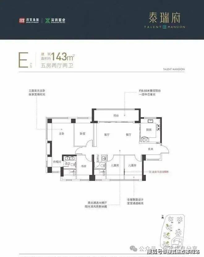 143㎡的5房2厅2卫,设计的是横厅南北通透格局,进门入户玄关,客餐厅6.55米开间,四开间朝南,分别做到了主卧20.71㎡/次卧9.25㎡/次卧7.9㎡/次卧7.89㎡/次卧6.69㎡(实测面积,去掉墙体),U型厨房,公卫三段式分离,得房率:77.48%(不含赠送),阳台主朝东南或西南向。套内面积110.88㎡+赠送面积22.95㎡=实得133.83㎡,加上赠送后得房率约93.51%。