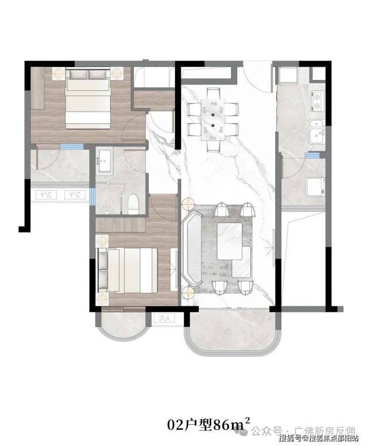 02户型:约86㎡,两房两厅一卫