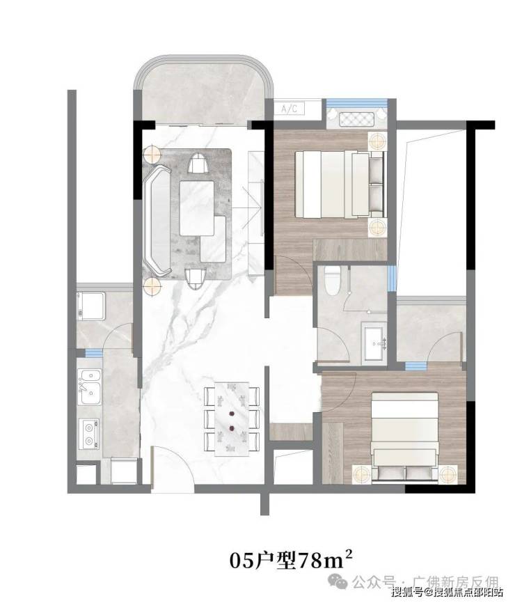 05户型:约78㎡,两房两厅一卫