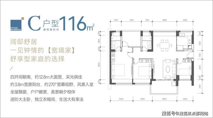116㎡4房2卫C户型,竖厅南北通透格局,类似双龙抱珠,客厅3.8米开间,四开间朝南,阳台主朝西南、东南或正南向。