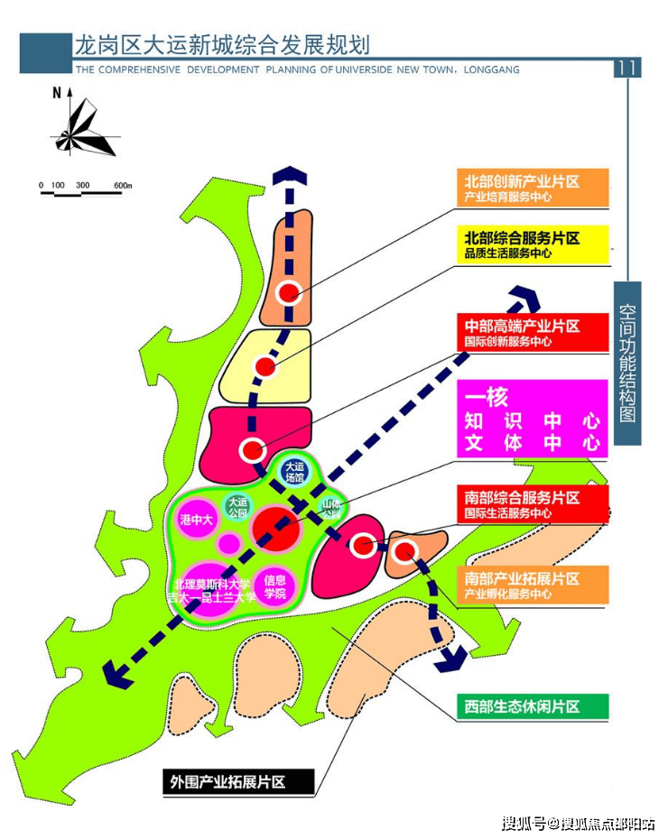 六片区为:北部创新产业片区:新型产业与科技产业服务区;北部综合服务片区:服务完善的生活配套示范区;中部高端产业片区:高端商务核心与产学研基地,形成智慧产业、现代服务业集聚区;南部综合服务片区:依托轨道站点形成多元复合的综合服务区;南部产业拓展片区:环境优美、成本适中的“龙岗研发孵化公园”;西部生态休闲片区:优质生态本底,与城区有机融合与渗透。