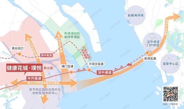 健康花城·璞悦位于中山城市人居未来的价值高地火炬新城。随着深中通道落定动工,热度持续高涨,GDP连续多年稳居中山第一,⽐肩深圳南⼭科技园、东莞松⼭湖。目前⽕炬区区内已⼊驻300多家知名企业、20多家世界500强企业,合力为周边产业、营商和居住提供符合未来需求的优质环境