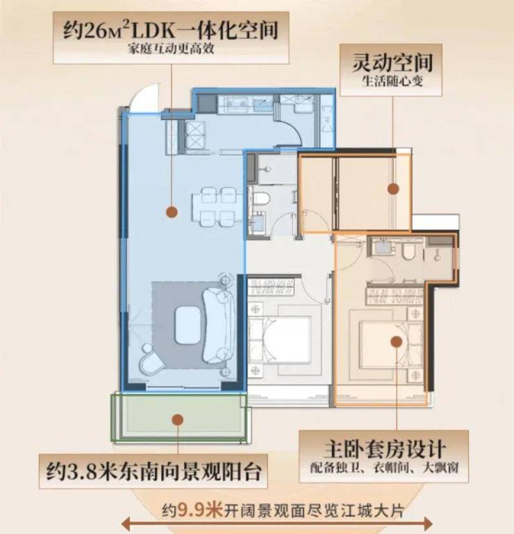 约26平的LDK一体化空间,既扩大公区,也能以无界空间促进家人交流。
