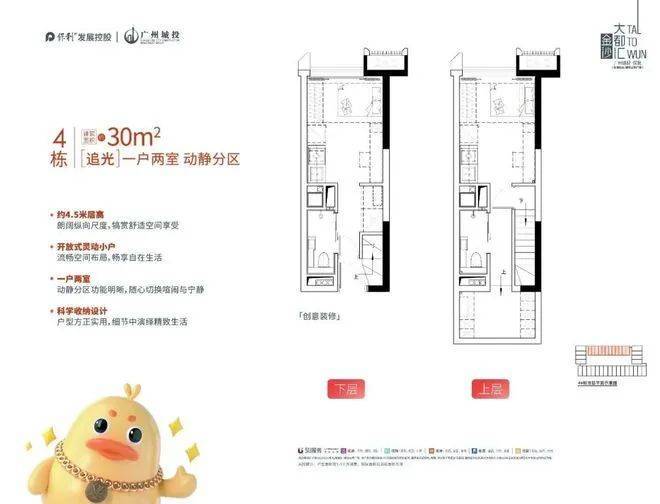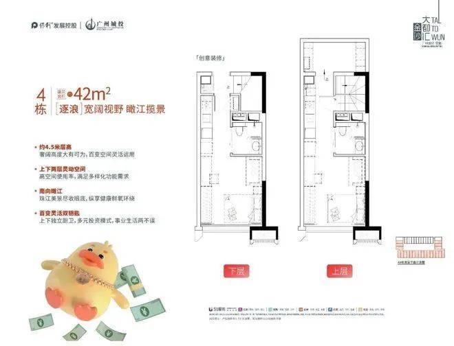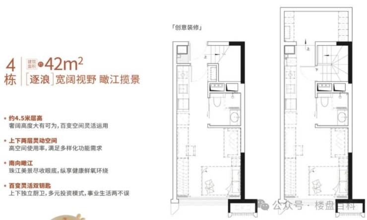 项目建面约30-42㎡,约4.5米高,属于产权房源,并且上下两层可独立入户,实行双钥匙管理,可实现自住,投资一步到位。