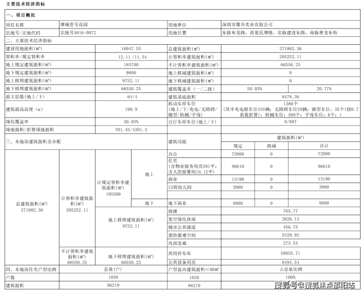 塘城总占地面积约1.69万㎡,总建筑面积约27.29万㎡,计容建筑面积约20.63万㎡,容积率12.17,绿化率30.05%。规划有1038户商品房,是整个项目中相对纯粹的部分,2梯3户/6梯8户,地下室有4层,规划停车位1386个,其中带充电桩车位435个,车位占比约1:1.33。
