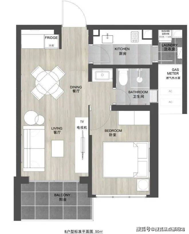 50㎡1房,带生活阳台,传统一房一厅布局。