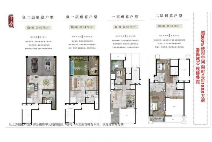 项目总规划共537户(含509套复式+28套叠墅),小区采用点状式布局,前后楼栋最大超百米楼间距,通风采光造景实现最大化。户型涵盖建面约110-128㎡复式四房以及建面约178-195㎡叠墅(上下叠)。