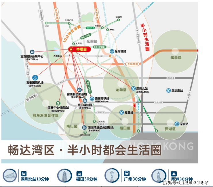 项目雄踞光明科学城西部门户,地处南光高速光明出入口(直线距离约500米),毗邻光明国际汽车城,周边交通路网发达,无缝互通广深莞惠;30min无阻通达宝安中心区、南山、松山湖,极速接驳深圳湾总部基地、南山科技园、前海中心区等城市重点片区