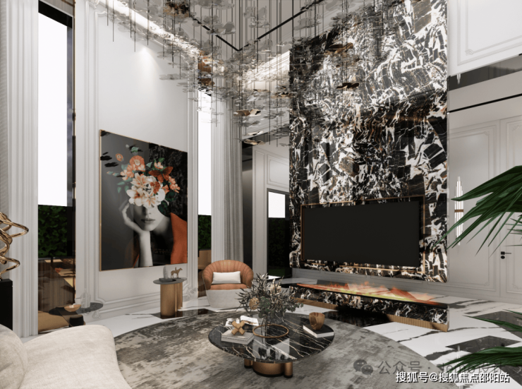 挑空的客厅设计,将古典与现代完美融合,充满了独特的品味和高雅的氛围。白色墙面与地面和背景墙的大理石元素相互交融,创造出宽敞舒适的生活空间,搭配意式家具尽显尊贵氛围。
