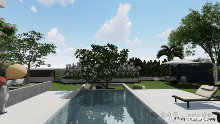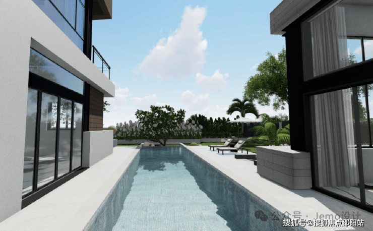In order to achieve intimate interaction between humans and nature, a hardened area was enlarged on one side of the swimming pool, forming an indoor outdoor interaction. The high and low scattered broad-leaved plants, with clean and simple shapes and distinct layers, become an interesting part of the courtyard, making people feel like they are in a tropical rainforest.