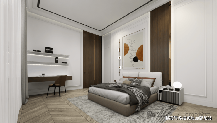一楼的卧室将意式和法式做了融合,房间的无主灯设计不仅满足日常所需的照明亮度,还能营造高级氛围感。搭配法式的石膏线条和鱼骨拼地板,整体看起来起来立体又大气。