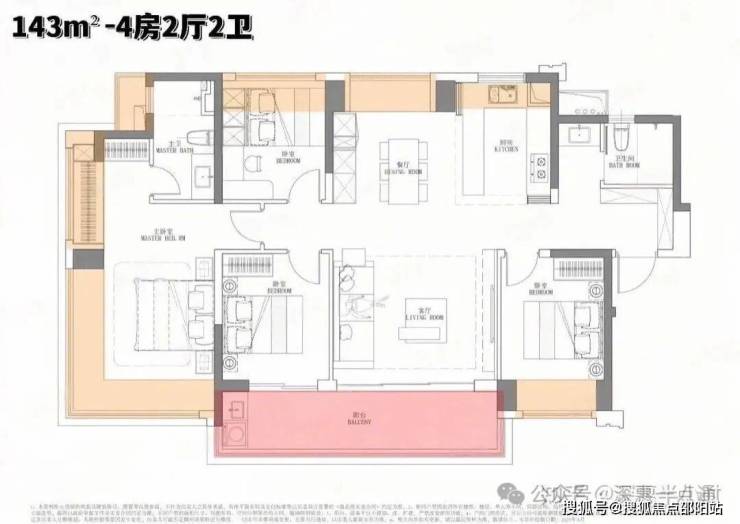 143m²的4房2厅2卫,设计的是竖厅南北通透格局,进门入户玄关,客厅4.5米开间,餐客厅分离设计,四开间朝南,全屋七面飘窗,主卧大套间做到了270度转角无柱飘窗,U型厨房,公卫三段式干湿分离,得房率约92.2%(包含赠送),客厅连接次卧出7.4米长的观景大阳台,全部主朝东南向,看大运中心+大运公园景观。