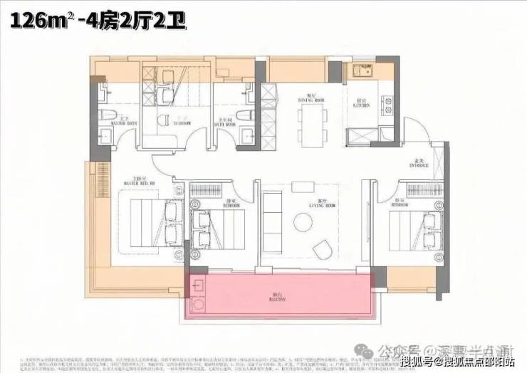 126m²的4房2厅2卫,设计的是竖厅南北通透格局,进门入户玄关,客厅4.3米开间,餐客厅分离设计,四开间朝南,全屋八面飘窗,主卧做到了270度转角无柱飘窗,U型厨房,卫生间干湿分离,得房率约95.2%(包含赠送),客厅连接次卧出7.1米长的观景大阳台,全部主朝西南向,看大运公园景观。